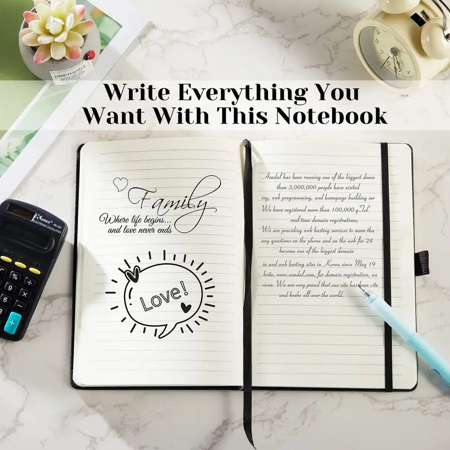 Thoughtful Design this PU leather hardcover notebook is designed to lay flat to make writing easier for both right and left handed users It comes with a pen loop for easy storage of pens, with ribbon bookmarks to help you find important content faster, elastic closure straps keep it closed securely, and rounded corner design does not hurt hands